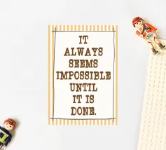 Bringen Sie Inspiration in Ihren Raum mit diesem Nelson Mandela Kunstdruck, der den aufmunternden Satz "It Always Seems Impossible Until Its's Done" in charmanten weißen handgezeichneten Buchstaben auf einem beruhigenden blauen Hintergrund zeigt. Dieses einzigartige Design ist eine Mischung aus Hoffnung und Ermutigung und damit ein durchdachtes Geschenk für Geburtstage, Abschlussfeiern oder Neuanfänge. Die verspielte, unschuldige Schrift und der auffallend blaue Farbton machen es zu einem herausragenden Stück für jedes Zuhause, Büro oder Arbeitszimmer, ideal für jeden, der täglich nach Positivität und einer Erinnerung an Durchhaltevermögen sucht.
