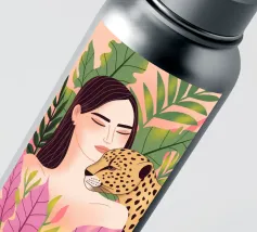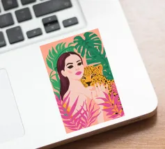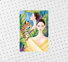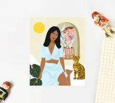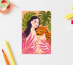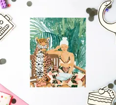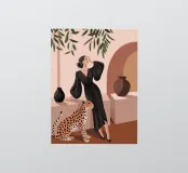 This artwork captures a person in a black dress striking a poised pose beside a leopard. The scene exudes sophistication, confidence, and timeless artistry.