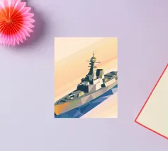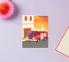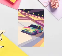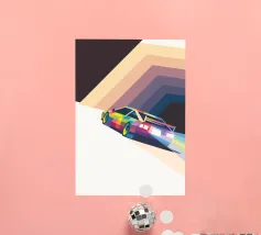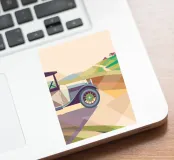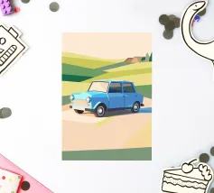 Holen Sie sich eine Illustration eines Oldtimers, der in der Landschaft fährt, in einem einzigartigen geometrischen Stil.