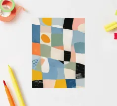 Eine lebendige, abstrakte Collage ähnelt einem Patchwork-Quilt mit verschiedenen Abschnitten mit unterschiedlichen Texturen, Mustern und Farben, die alle in einer harmonischen und verspielten Komposition zusammengefügt sind.