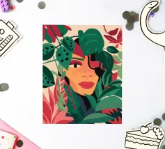 Das Porträt einer Frau mit wallendem rotem Haar, umgeben von stilisierten Blättern und Blumen, die nachdenklich zur Seite blickt. Der Stil ist modern, kühn und leicht jugendstilig.