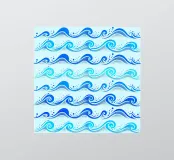 Whimsical aquatic coastal pattern with rolling ocean waves in cobalt blue and aqua blue, on a light blue background.