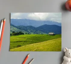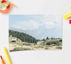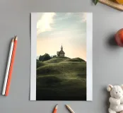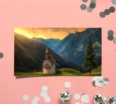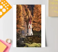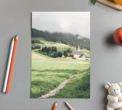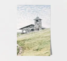 Umgeben von weiten Wiesen und sich wiegendem Gras, überblickt es das Tal mit ruhiger Anmut. Die Luft ist still, erfüllt vom Duft der Wildblumen und dem fernen Gesang der Vögel. Das schlichte Kreuz der Kapelle ragt in den Himmel, ein Symbol der Ruhe und Einsamkeit.