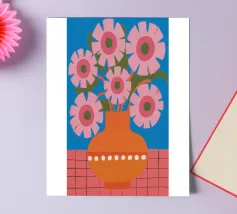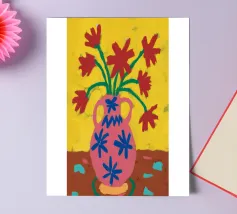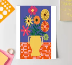 Ein fröhliches Stillleben mit einem Strauß roter Mohnblumen in einer Terrakotta-Vase vor einem heiteren, patchworkartigen Hintergrund aus gelben und blauen Fliesen.