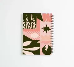 A modern, abstract composition featuring a patchwork of various patterns and shapes. Elements include organic leaf like forms, geometric grids, and abstract textures in a muted palette of pink, black, and beige, reflecting a bohemian, eclectic style.