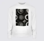 Eine lebhafte Reihe von sich überlappenden Kreisen in verschiedenen Grau-, Schwarz- und Weißtönen schafft ein ansprechendes visuelles Muster. Das Design zeichnet sich durch kontrastierende Farbtöne aus, die für Tiefe sorgen.