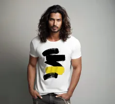 Kühne schwarze Kurven verflechten sich mit einem leuchtenden goldenen Quadrat in der Mitte und schaffen eine dynamische und abstrakte Komposition. Das Zusammenspiel von dunklen und hellen Kontrasten verleiht dem Design Tiefe und Bewegung.