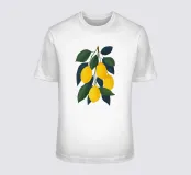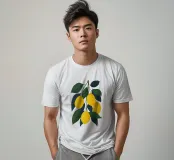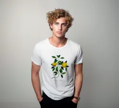 Das Bild zeigt eine wunderschöne botanische Illustration von reifen, gelben Zitronen, die an einem Zweig hängen. Die Zitronen haben eine leicht strukturierte Oberfläche und sind umgeben von dunkelgrünen Blättern, die lebendig und detailliert dargestellt sind. Der Hintergrund ist schlicht und hell, wodurch die Zitronen und Blätter besonders hervorgehoben werden. Der Stil der Illustration ist naturgetreu und detailliert, fast wissenschaftlich, aber mit einem Hauch von künstlerischer Freiheit. Die Farben sind kräftig und kontrastreich, was das Bild lebendig und harmonisch macht.