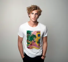 Ein atemberaubender Blick auf eine lebhafte mediterrane Treppe, flankiert von bunten Gebäuden und üppigen Palmen. Die Perspektive lenkt den Blick nach oben in Richtung eines strahlenden Himmels und vermittelt ein Gefühl von Optimismus, Abenteuer und dem Traum von einem perfekten Sommerurlaub.