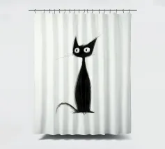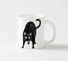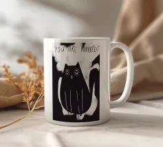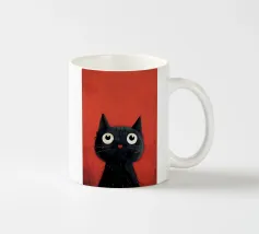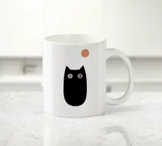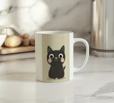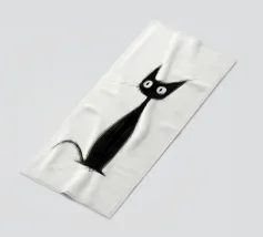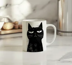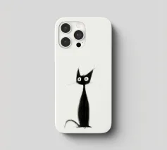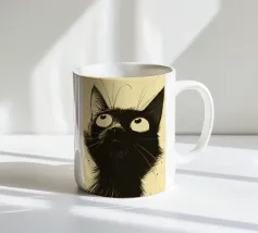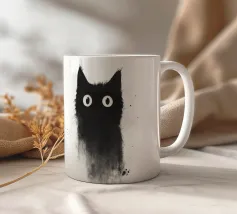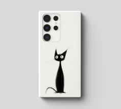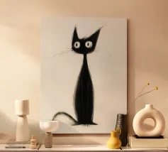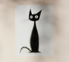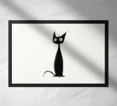 Eine minimalistische Schwarz-Weiß-Illustration einer geschmeidigen, schwarzen Katze mit übertrieben großen Augen und skizzenhaften Zügen. Das skurrile und abstrakte Design der Katze verleiht ihr eine verspielte, künstlerische Note.
