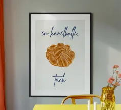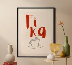 Mehrere Kaffeetassen sind spielerisch ineinander gestapelt und bilden ein harmonisches, minimalistisches Motiv. Dazu erscheint der schwedische Schriftzug „en kopp kaffe, tack“ („eine Tasse Kaffee, bitte“). Die Kombination wirkt warm, einladend und typisch skandinavisch.