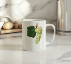 Eine Traube mit leuchtend grünen Trauben ruht vor einem blassen Hintergrund, der von sanftem Licht erhellt wird, das ihre glänzende Textur und ihre subtilen Schatten hervorhebt.