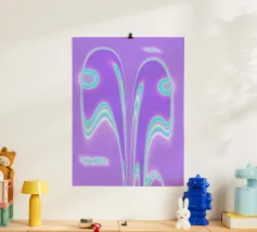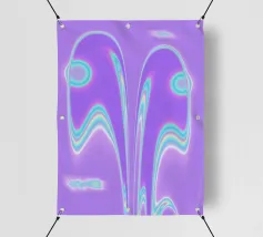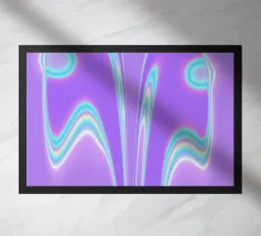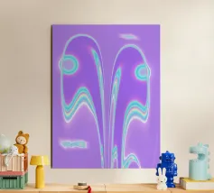 Zwei Formen mit verschmolzenen Konturen stehen sich gegenüber, als würden sie schweben. Ihre irisierenden Farben wellen sich auf einem lavendelfarbenen Hintergrund und erzeugen eine ruhige, hypnotische Wirkung. Das Bild erinnert an einen stillen Dialog zwischen zwei abstrakten Entitäten, die in einem schwebenden Raum nahe beieinander liegen und doch voneinander getrennt sind.