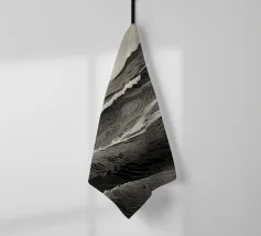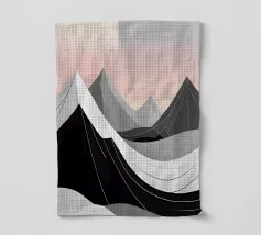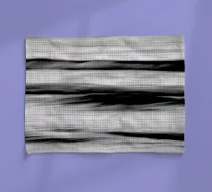 Gebogene schwarze und weiße Wellen wellen sich über die Leinwand und bilden eine abstrakte Landschaft. Die fließenden Übergänge schaffen ein Gefühl von Rhythmus und Tiefe und laden zu Kontemplation und Kreativität ein.