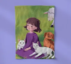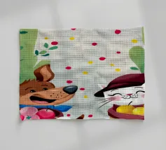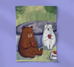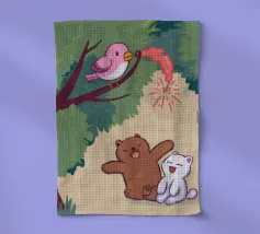 Dieses Kunstwerk zeigt eine mürrisch aussehende Wolke mit einer Gedankenblase, die einen Vogel und einen Bären enthält. Die humorvolle und fantasievolle Szene ist vor einem sanften blauen Hintergrund zu sehen.
