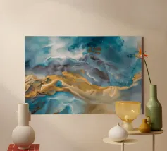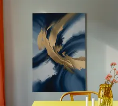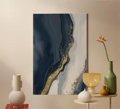 Dieser elegante, abstrakte Hintergrund zeigt fließende Gold- und Silberelemente mit kreisförmigen Akzenten auf einer sattblauen Leinwand und sorgt so für eine beeindruckende visuelle Wirkung, die sich für kreative Projekte eignet.