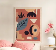A sophisticated abstract piece with layered, semi transparent shapes in a warm palette of red, pink, and ochre, creating depth and a sense of gentle movement.