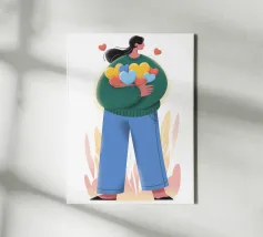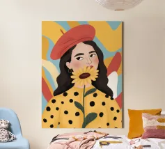 Dieses Kunstwerk zeigt eine Person mit kurzen blonden Haaren, die eine geblümte Jacke trägt und ein Buch hält. Der leuchtend gelbe Hintergrund unterstreicht die schicke und stilvolle Essenz.