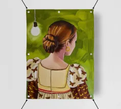 Dieses Kunstwerk zeigt eine Person, die auf einem gestreiften Stuhl sitzt, umgeben von Sonnenblumen und einer grünen Tasche. Der Hintergrund ist ein gedämpftes Braun, das eine rustikale und nachdenkliche Atmosphäre schafft.