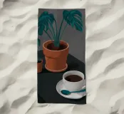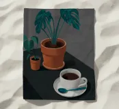 Ein einfaches, stimmungsvolles Stillleben mit einer Tasse schwarzen Kaffees neben einer getopften Monstera-Pflanze. Die dunkle, stimmungsvolle Beleuchtung schafft eine anspruchsvolle, ruhige und kontemplative Morgenszene.