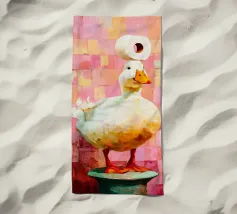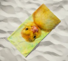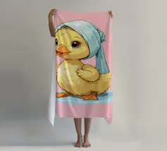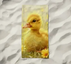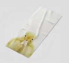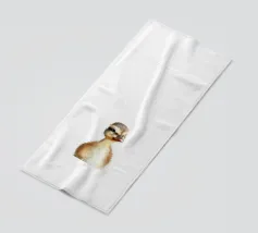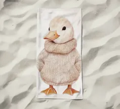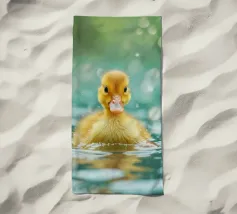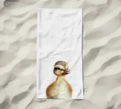 Ein niedliches Entenküken lugt unter einem weichen weißen Handtuch hervor. Seine flauschigen gelben Federn und seine neugierigen Augen schaffen eine bezaubernde und charmante Szene.