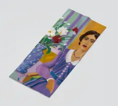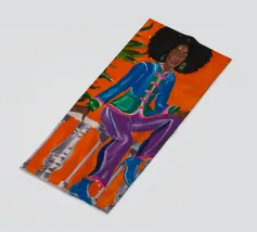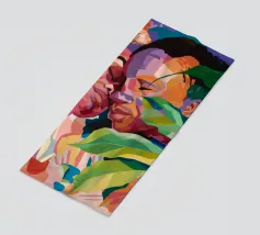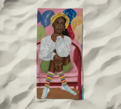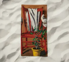 Dieses Kunstwerk zeigt eine Person, die auf einem gestreiften Stuhl sitzt, umgeben von Sonnenblumen und einer grünen Tasche. Der Hintergrund ist ein gedämpftes Braun, das eine rustikale und nachdenkliche Atmosphäre schafft.