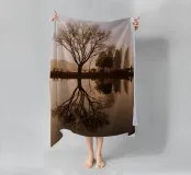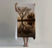 The water below mirrors the tree perfectly, capturing every leaf and curve in a soft, shimmering reflection. The surface is calm, like glass, blurring the line between reality and its mirrored twin. As light shifts gently across the scene, the reflection seems to move with it — a quiet dance of nature and water, beauty and balance