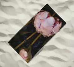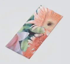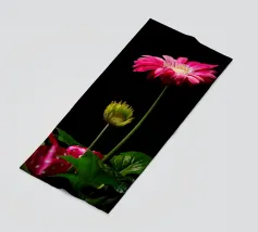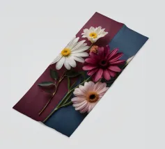 Ein spiralgebundenes Notizbuch mit drei rosafarbenen Blumen und grünen Blättern auf einer bunten Holzoberfläche lädt zu Kreativität und Inspiration ein.