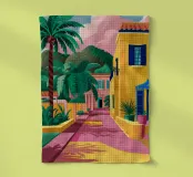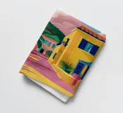 Eine Landschaftsillustration eines Weges, der sich einen gelben Hügel hinunter in Richtung einer Küstenstadt schlängelt. Die kräftigen Farben und langen Schatten schaffen eine dramatische, moderne und lebendige Szene einer Reise ans Meer.
