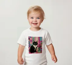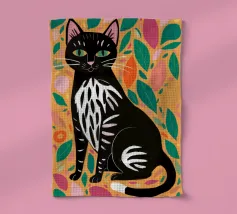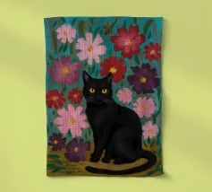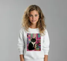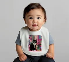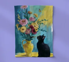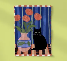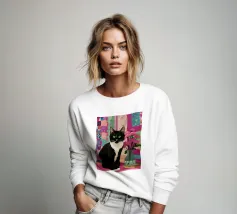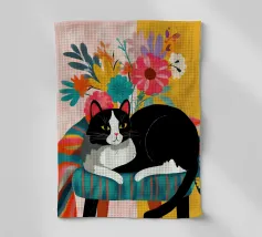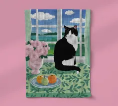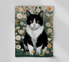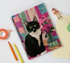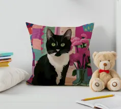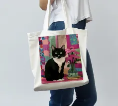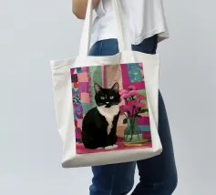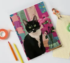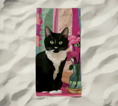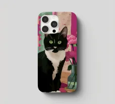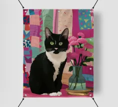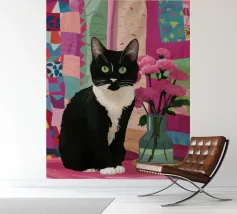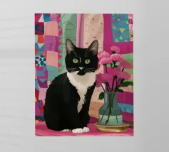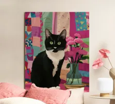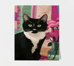 Eine charmante Illustration einer schwarz-weißen Smoking-Katze, die stolz vor einer Vase mit rosa Pfingstrosen sitzt, vor einem gemusterten Hintergrund. Das Kunstwerk ist eine süße und stilvolle Ode an Katzen und Blumen.