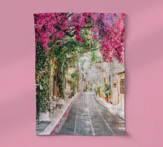 Genießen Sie den Zauber von Oia, Santorin, mit dieser malerischen Fotografie am Hang, die die weiß getünchten Gebäude, die blauen Kuppeln und den weiten Blick auf das Ägäische Meer zeigt. Die erhöhte Perspektive fängt den vielschichtigen Charme und die sonnenbeschienene Schönheit dieses weltberühmten griechischen Reiseziels ein. Dieser Druck eignet sich perfekt für Häuser an der Küste, mediterran inspirierte Innenräume und reisethematische Dekorationen und verleiht jeder Wand Wärme, Eleganz und Fernweh.