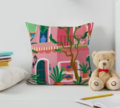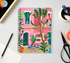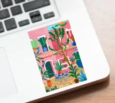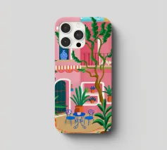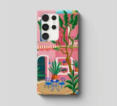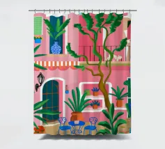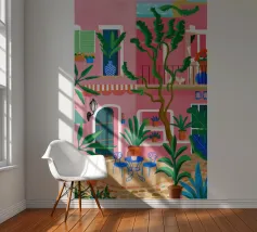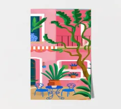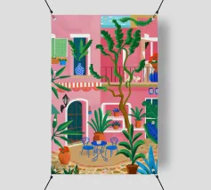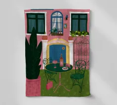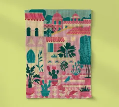 Die Illustration eines wunderschönen mediterranen Balkons, der mit Pflanzen und Blumen übersät ist und auf eine lebhafte Straßenszene mit bunten Gebäuden blickt, fängt die Essenz eines lebhaften europäischen Sommers ein.