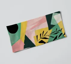 Eine dynamische abstrakte Komposition sich überlagernder botanischer und landschaftlicher Formen in einer warmen Farbpalette aus Orange, Teal und Beige, die eine moderne und energiegeladene Interpretation der Natur darstellt.