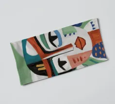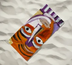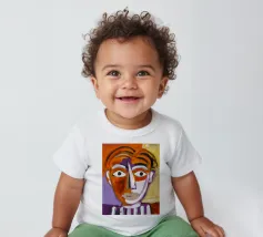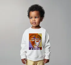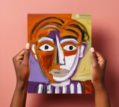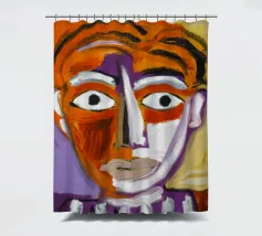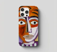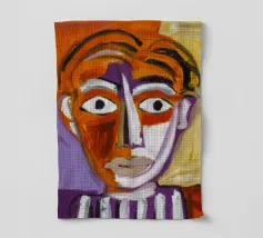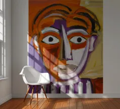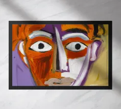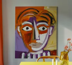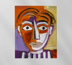 Dieses Gemälde zeigt ein stilisiertes Gesicht mit kräftigen Farben und geometrischen Formen. Das Gesicht hat große, ausdrucksstarke Augen, eine markante Nase und ein gestreiftes Hemd. Der Hintergrund ist eine Mischung aus orangefarbenen und gelben Tönen.