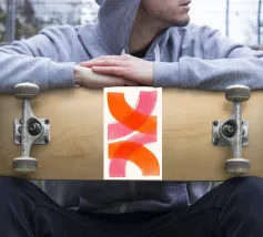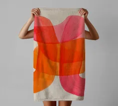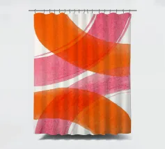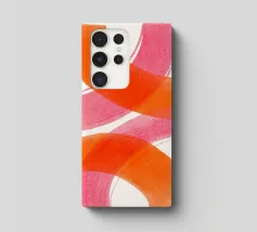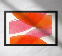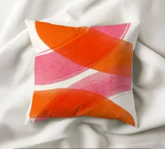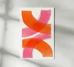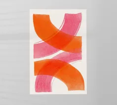 Dieses abstrakte Kunstwerk zeigt schwungvolle, breite überlappende Linien in kräftigem Orange und Pink auf hellen Hintergrund. Die dynamische Komposition erzeugt ein Gefühl von Bewegung und Leichtigkeit. Ein modernes, minimalistisches Design, das Farbe und Energie in jeden Raum bringt.