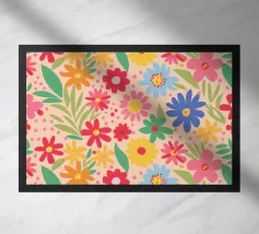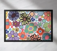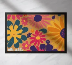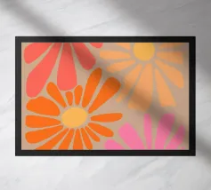Ein verspieltes Blumenmuster, das wie ein visueller Spaziergang durch ein Retro-Gartenfestival wirkt: Die stilisierten Blüten – in Orange, Pink, Lila, Rot und Gelb – tanzen frei. Jede Blume hat eine einfache, margeritenartige Form mit langen, strahlenförmigen Blütenblättern, die aus einem zentralen Punkt hervorgehen. Die Anordnung ist bewusst unregelmäßig – wie ein Streumuster aus Freude, Sommer und Nostalgie.