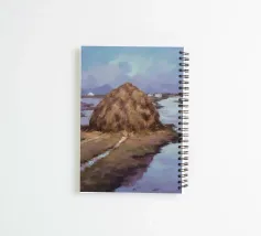 A landscape painting featuring a large haystack in a field near a calm river or body of water. The sky is a muted, overcast grey, and the overall palette is subdued with earthy tones.