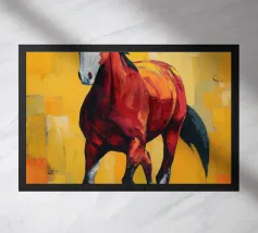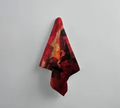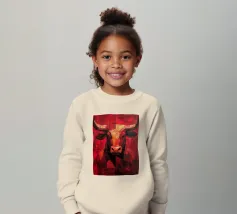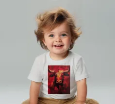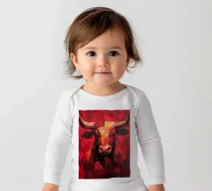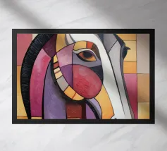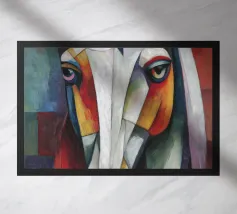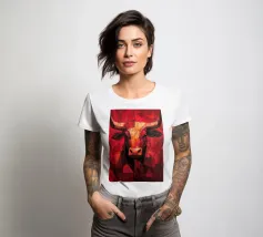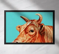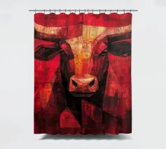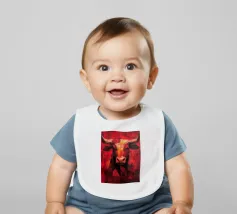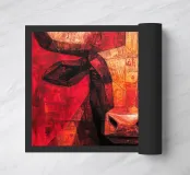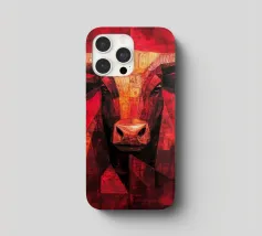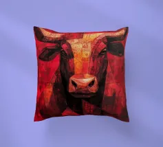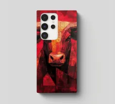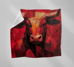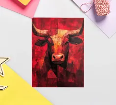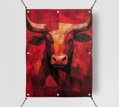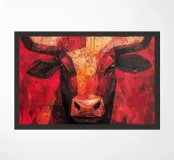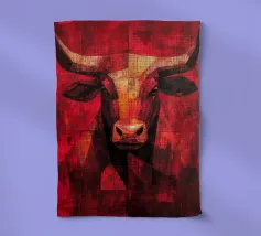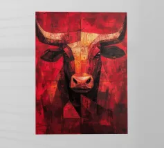 A commanding abstract portrayal of a bull’s head, constructed from layered planes, distressed textures, and intense tonal depth. Set against a powerful red field, the form feels monumental and symbolic, evoking strength, resolve, and raw presence. Fragmented surfaces and collage-like detailing add complexity, giving the piece a sense of history and weight beneath its bold exterior.