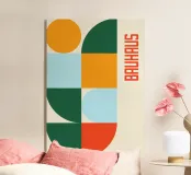 Un cartel abstracto vibrante y equilibrado que presenta una columna vertical de formas geométricas entrelazadas, principalmente semicírculos y cuadrados, sobre un fondo crema. El diseño utiliza una sofisticada paleta de verde bosque intenso, naranja brillante, azul claro pálido y un cálido rojo coral. Esta composición modular, que sugiere sutilmente un motivo botánico o floral, encarna a la perfección los principios funcionalistas y estéticos de los movimientos Bauhaus y Moderno de mediados de siglo. La palabra "BAUHAUS" aparece verticalmente a la derecha en un tipo de letra rojo, audaz y apilado. Descarga digital de alta calidad (7000x5000 píxeles).