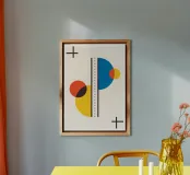 Un cartel abstracto, equilibrado y dinámico, muy influido por los movimientos Bauhaus y Suprematismo. La composición presenta una disposición de círculos y semicírculos superpuestos y entrecruzados en atrevidos colores primarios: rojo, amarillo y azul. Un elemento vertical central, compuesto por dos líneas continuas que flanquean una línea de puntos, divide el lienzo, mientras que unos sencillos símbolos negros en forma de cruz anclan las esquinas superior izquierda e inferior derecha. Este diseño muestra un dominio de la abstracción geométrica y el equilibrio visual. Esta descarga digital de alta calidad (7000x5000 píxeles, 300 ppp) garantiza un arte nítido y museístico.