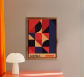 Un poderoso póster abstracto Bauhaus dominado por un mosaico geométrico de cuadrados, triángulos y cuartos de círculo en una atrevida paleta de inspiración primaria: rojo intenso, azul marino y melocotón/naranja cálido. La composición presenta un llamativo bloque vertical azul marino a la derecha y una banda horizontal melocotón en la parte inferior, creando una fuerte división. Este diseño encarna a la perfección la belleza estructurada y funcional del Modernismo. Este archivo de póster digital de calidad superior (7000x5000 píxeles, 300 ppp) garantiza detalles de alta resolución y colores ricos e impactantes para una impresión de primera calidad.