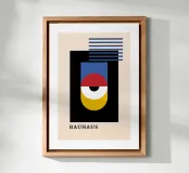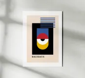 Una impresionante abstracción geométrica que resume a la perfección los movimientos Bauhaus y Constructivismo. Este dinámico póster presenta un motivo central en capas que se asemeja a un ojo o una diana, compuesto por los colores primarios -rojo, azul y amarillo- sobre un crudo rectángulo negro. La composición se acentúa con una serie de rayas azules horizontales flotantes, que constituyen una clase magistral de equilibrio y contraste. Este diseño vibrante e intelectual es una pieza ideal para los coleccionistas de arte moderno de mediados de siglo, maximalista o abstracto que aprecian la pureza de la forma y el color. El texto dice "BAUHAUS