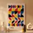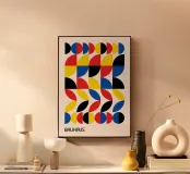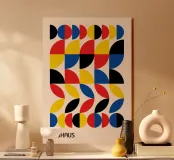 Un cartel vibrante y clásico de estilo Bauhaus con un patrón denso, modular y rítmico. La composición está formada por círculos y semicírculos en los icónicos colores primarios rojo, azul y amarillo, además del negro, sobre un fondo blanco cremoso. Esta obra es un ejemplo perfecto del diseño modernista, que hace hincapié en las formas fundamentales y la teoría del color. Este póster digital de alta calidad se presenta con una resolución superior de 7000x5000 píxeles, 300 ppp, lo que garantiza una exquisita profundidad de color y una claridad excepcional para una impresión de pared impresionante y de alta calidad.