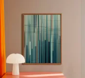 Una moderna impresión digital abstracta con una composición de líneas verticales en una relajante paleta de colores de azules, verdes azulados, marrones y beiges apagados. Las líneas varían en anchura y tono, creando una sensación de profundidad y ritmo, mientras que las sutiles líneas horizontales añaden un contraste dinámico. Esta pieza evoca una sensación de calma y sofisticación, por lo que es un complemento perfecto para salones, oficinas o dormitorios contemporáneos.