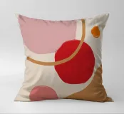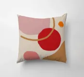 Una obra abstracta minimalista con un fondo texturizado de color rosa rubor y formas sencillas y equilibradas en rojo y crema. La pieza es sofisticada, moderna y tiene una calidad táctil y serena.