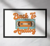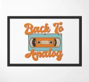 Un canto de amor visual a la era analógica: en el centro, un estilizado casete de audio en naranja, negro y gris, enmarcado en un estuche azul, símbolo icónico de la era de los VHS y las cintas mezcladas. Las letras "Back To Analogue" en tipografía naranja curvada con un borde azul sombreado llegan al corazón del mensaje: lo retro no es solo estilo, es actitud.