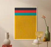 Póster abstracto minimalista con un bloque dominante de color amarillo mostaza intenso, superpuesto a una serie de líneas verticales deliberadamente irregulares, dibujadas a mano en carbón oscuro. Esta sección principal está rematada por una barra horizontal de bloques de color compuesta por tres franjas distintas: carbón oscuro, rojo vibrante y verde azulado intenso. La sencilla composición contrasta la precisión geométrica (los bloques de color) con la irregularidad orgánica (las líneas), creando una estética única de la modernidad de mediados de siglo. Esta descarga digital de alta calidad (7000x5000 píxeles, 300 ppp) ofrece una impresión artística nítida y moderna.