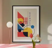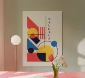 Una reproducción digital magistralmente estratificada de un diseño de la Bauhaus de 1923, que celebra la influencia constructivista. Esta vibrante composición abstracta presenta una dinámica interacción de formas geométricas básicas -círculos, cuadrados, rectángulos y triángulos- superpuestas para crear nuevas formas. La llamativa paleta utiliza los colores primarios de la Bauhaus: rojo vivo, amarillo brillante y azul marino intenso, sobre un fondo beige claro y cremoso. Acentos como un rectángulo a rayas y un texto vertical añaden profundidad visual. Este estampado encarna a la perfección la dedicación del movimiento a la teoría fundamental de la forma y el color.
