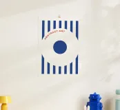 Un ejemplo audaz e icónico del diseño gráfico minimalista de la Bauhaus, centrado en la geometría pura y el alto contraste. La composición presenta un llamativo patrón de rayas verticales blancas y azules intensas, superpuestas de forma espectacular por un gran anillo blanco y un círculo azul centrado, creando un convincente efecto de objetivo o lente. El diseño muestra el poderoso uso del espacio negativo y la forma abstracta, declarando explícitamente su tema con el texto rojo curvado, "ARTE ABSTRACTO". Esta impresión atemporal es perfecta para añadir una sofisticación limpia y modernista a un espacio minimalista, Scandi o Mid Century Modern. Se trata de un
