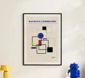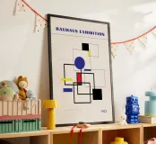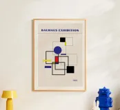 Un sofisticado cartel abstracto inspirado en la Exposición de la Bauhaus de 1923, que demuestra claramente la influencia del De Stijl y el neoplasticismo. La composición, compleja pero equilibrada, presenta una estructura estratificada de cuadrados y rectángulos de líneas negras superpuestas, puntuada por bloques sólidos de colores primarios (rojo, azul y amarillo) y un círculo central azul. Esta obra de arte encarna los principios de la abstracción, la precisión geométrica y la armonía cromática, lo que la convierte en una pieza atemporal de diseño modernista. Es un punto focal ideal para cualquier interior minimalista, Mid Century Modern o contemporáneo. El texto dice "BAU